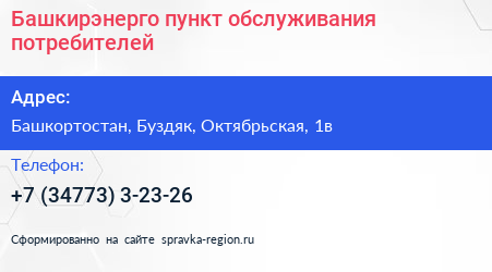 Башкирэнерго, пункт обслуживания потребителей по адресу Башкортостан, Буздяк, Октябрьская, 1в в дальнейшем Организация, размещена в следующих категориях: