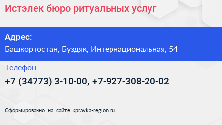 Истэлек, бюро ритуальных услуг по адресу Башкортостан, Буздяк, Интернациональная, 54 в дальнейшем Организация, размещена в следующих категориях:
