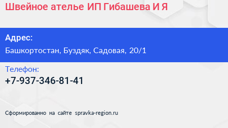 Швейное ателье, ИП Гибашева И.Я. по адресу Башкортостан, Буздяк, Садовая, 20/1 в дальнейшем Организация, размещена в следующих категориях:
