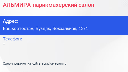 АЛЬМИРА, парикмахерский салон по адресу Башкортостан, Буздяк, Вокзальная, 13/1 в дальнейшем Организация, размещена в следующих категориях: