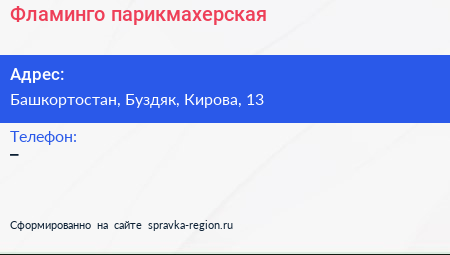 Фламинго, парикмахерская по адресу Башкортостан, Буздяк, Кирова, 13 в дальнейшем Организация, размещена в следующих категориях: