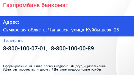 Газпромбанк, банкомат по адресу Самарская область, Чапаевск, улица Куйбышева, 25 в дальнейшем Организация, размещена в следующих категориях: