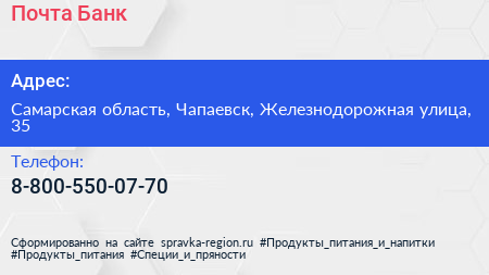 Почта Банк по адресу Самарская область, Чапаевск, Железнодорожная улица, 35 в дальнейшем Организация, размещена в следующих категориях: