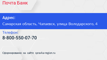 Почта Банк по адресу Самарская область, Чапаевск, улица Володарского, 4 в дальнейшем Организация, размещена в следующих категориях: