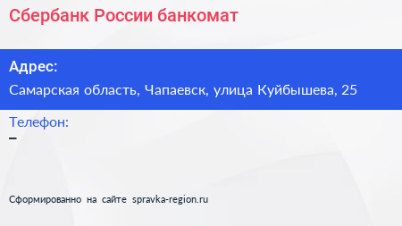 Сбербанк России, банкомат по адресу Самарская область, Чапаевск, улица Куйбышева, 25 в дальнейшем Организация, размещена в следующих категориях: