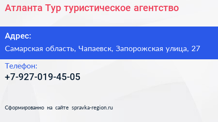 Атланта-Тур, туристическое агентство по адресу Самарская область, Чапаевск, Запорожская улица, 27 в дальнейшем Организация, размещена в следующих категориях: