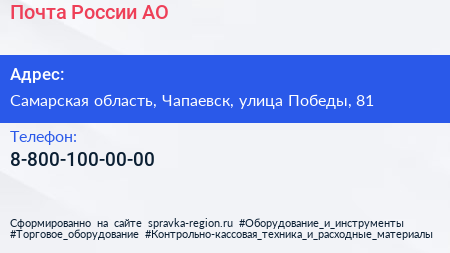 Почта России, АО по адресу Самарская область, Чапаевск, улица Победы, 81 в дальнейшем Организация, размещена в следующих категориях: