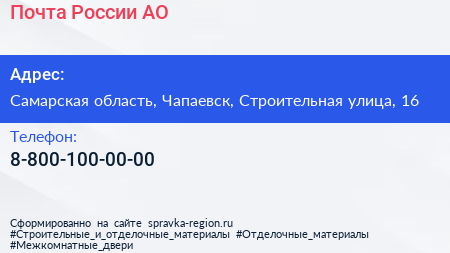 Почта России, АО по адресу Самарская область, Чапаевск, Строительная улица, 16 в дальнейшем Организация, размещена в следующих категориях: