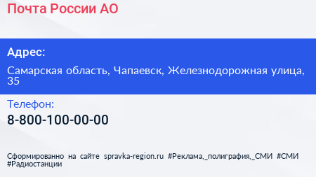 Почта России, АО по адресу Самарская область, Чапаевск, Железнодорожная улица, 35 в дальнейшем Организация, размещена в следующих категориях:
