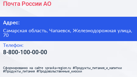 Почта России, АО по адресу Самарская область, Чапаевск, Железнодорожная улица, 70 в дальнейшем Организация, размещена в следующих категориях: