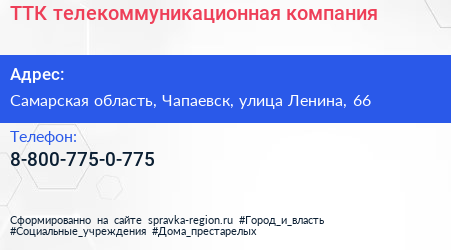 ТТК, телекоммуникационная компания по адресу Самарская область, Чапаевск, улица Ленина, 66 в дальнейшем Организация, размещена в следующих категориях:
