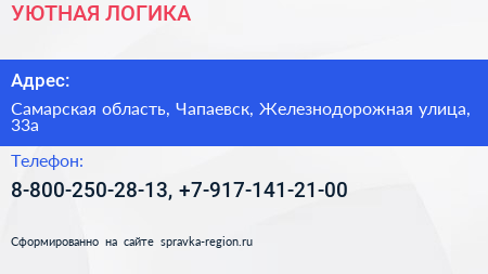 УЮТНАЯ ЛОГИКА по адресу Самарская область, Чапаевск, Железнодорожная улица, 33а в дальнейшем Организация, размещена в следующих категориях: