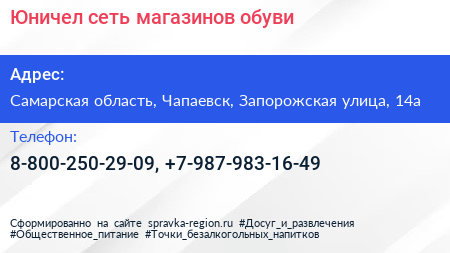 Юничел, сеть магазинов обуви по адресу Самарская область, Чапаевск, Запорожская улица, 14а в дальнейшем Организация, размещена в следующих категориях: