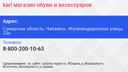 kari, магазин обуви и аксессуаров по адресу Самарская область, Чапаевск, Железнодорожная улица, 33а в дальнейшем Организация, размещена в следующих категориях: