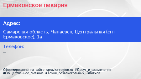 Ермаковское, пекарня по адресу Самарская область, Чапаевск, Центральная (снт Ермаковское), 1а в дальнейшем Организация, размещена в следующих категориях: