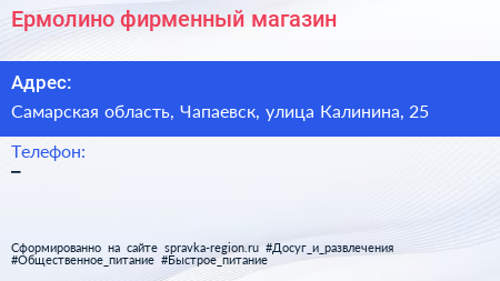 Ермолино, фирменный магазин по адресу Самарская область, Чапаевск, улица Калинина, 25 в дальнейшем Организация, размещена в следующих категориях: