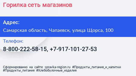 Горилка, сеть магазинов по адресу Самарская область, Чапаевск, улица Щорса, 100 в дальнейшем Организация, размещена в следующих категориях: