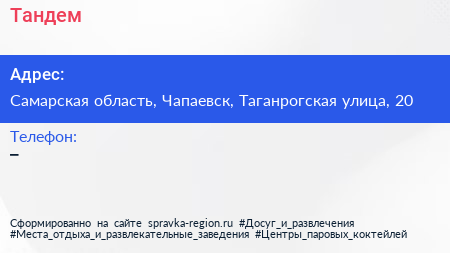 Тандем по адресу Самарская область, Чапаевск, Таганрогская улица, 20 в дальнейшем Организация, размещена в следующих категориях: