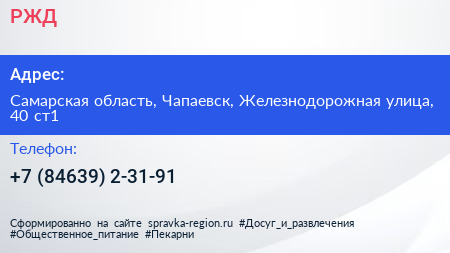 РЖД по адресу Самарская область, Чапаевск, Железнодорожная улица, 40 ст1 в дальнейшем Организация, размещена в следующих категориях: