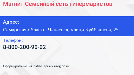 Магнит Семейный, сеть гипермаркетов по адресу Самарская область, Чапаевск, улица Куйбышева, 25 в дальнейшем Организация, размещена в следующих категориях: