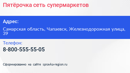 Пятёрочка, сеть супермаркетов по адресу Самарская область, Чапаевск, Железнодорожная улица, 39 в дальнейшем Организация, размещена в следующих категориях: