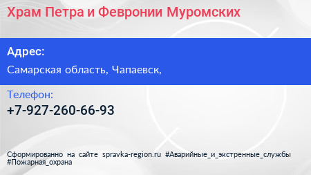 Храм Петра и Февронии Муромских по адресу Самарская область, Чапаевск, в дальнейшем Организация, размещена в следующих категориях: