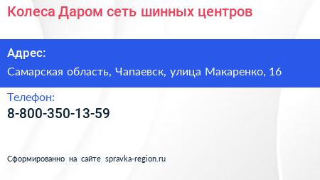 Колеса Даром, сеть шинных центров по адресу Самарская область, Чапаевск, улица Макаренко, 16 в дальнейшем Организация, размещена в следующих категориях: