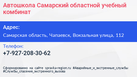 Автошкола, Самарский областной учебный комбинат по адресу Самарская область, Чапаевск, Вокзальная улица, 112 в дальнейшем Организация, размещена в следующих категориях: