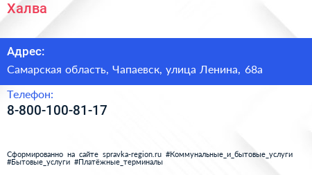 Халва по адресу Самарская область, Чапаевск, улица Ленина, 68а в дальнейшем Организация, размещена в следующих категориях: