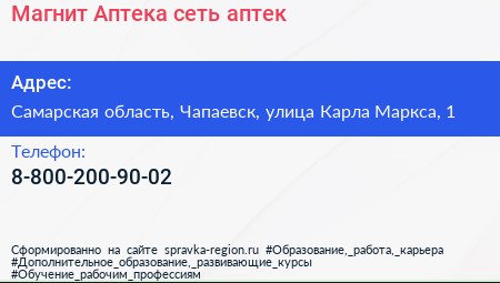 Магнит Аптека, сеть аптек по адресу Самарская область, Чапаевск, улица Карла Маркса, 1 в дальнейшем Организация, размещена в следующих категориях: