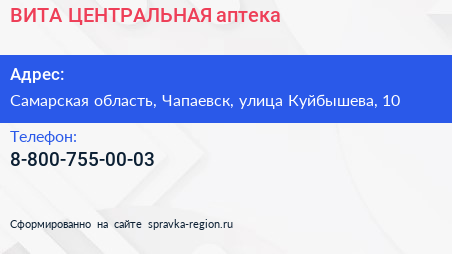 ВИТА ЦЕНТРАЛЬНАЯ, аптека по адресу Самарская область, Чапаевск, улица Куйбышева, 10 в дальнейшем Организация, размещена в следующих категориях: