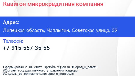 Квайгон, микрокредитная компания по адресу Липецкая область, Чаплыгин, Советская улица, 39 в дальнейшем Организация, размещена в следующих категориях: