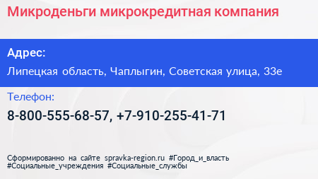 Микроденьги, микрокредитная компания по адресу Липецкая область, Чаплыгин, Советская улица, 33е в дальнейшем Организация, размещена в следующих категориях: