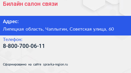 Билайн, салон связи по адресу Липецкая область, Чаплыгин, Советская улица, 60 в дальнейшем Организация, размещена в следующих категориях: