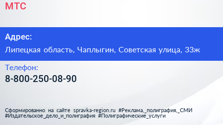 МТС по адресу Липецкая область, Чаплыгин, Советская улица, 33ж в дальнейшем Организация, размещена в следующих категориях: