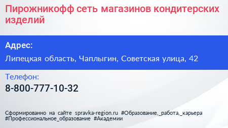 Пирожникофф, сеть магазинов кондитерских изделий по адресу Липецкая область, Чаплыгин, Советская улица, 42 в дальнейшем Организация, размещена в следующих категориях: