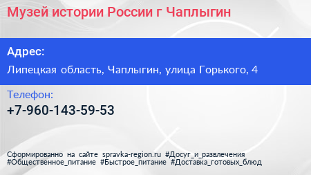 Музей истории России г. Чаплыгин по адресу Липецкая область, Чаплыгин, улица Горького, 4 в дальнейшем Организация, размещена в следующих категориях:
