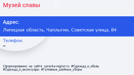 Музей славы по адресу Липецкая область, Чаплыгин, Советская улица, 84 в дальнейшем Организация, размещена в следующих категориях: