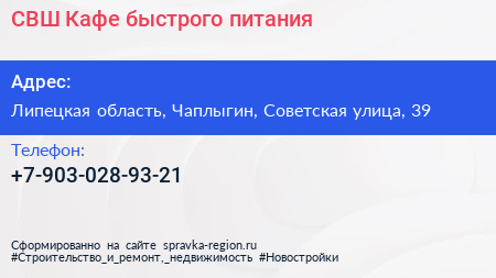СВШ, Кафе быстрого питания по адресу Липецкая область, Чаплыгин, Советская улица, 39 в дальнейшем Организация, размещена в следующих категориях: