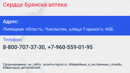Сердце Брянска, аптека по адресу Липецкая область, Чаплыгин, улица Горького, 46Б в дальнейшем Организация, размещена в следующих категориях: