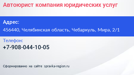 Автоюрист, компания юридических услуг по адресу 456440, Челябинская область, Чебаркуль, Мира, 2/1 в дальнейшем Организация, размещена в следующих категориях: