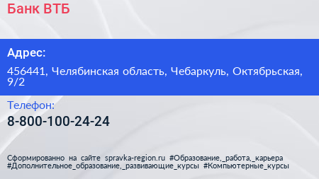 Банк ВТБ по адресу 456441, Челябинская область, Чебаркуль, Октябрьская, 9/2 в дальнейшем Организация, размещена в следующих категориях: