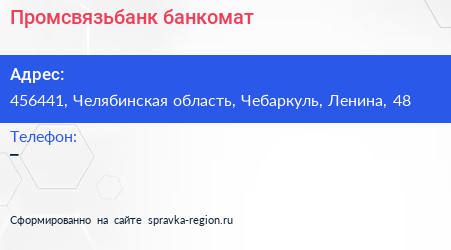 Промсвязьбанк, банкомат по адресу 456441, Челябинская область, Чебаркуль, Ленина, 48 в дальнейшем Организация, размещена в следующих категориях: