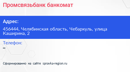 Промсвязьбанк, банкомат по адресу 456444, Челябинская область, Чебаркуль, улица Каширина, 2 в дальнейшем Организация, размещена в следующих категориях:
