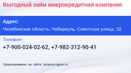Выгодный займ, микрокредитная компания по адресу Челябинская область, Чебаркуль, Советская улица, 32 в дальнейшем Организация, размещена в следующих категориях: