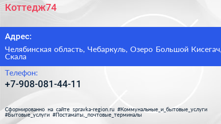 Коттедж74 по адресу Челябинская область, Чебаркуль, Озеро Большой Кисегач, Скала в дальнейшем Организация, размещена в следующих категориях: