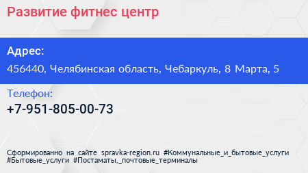 Развитие, фитнес-центр по адресу 456440, Челябинская область, Чебаркуль, 8 Марта, 5 в дальнейшем Организация, размещена в следующих категориях: