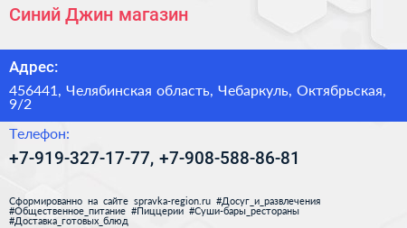 Синий Джин, магазин по адресу 456441, Челябинская область, Чебаркуль, Октябрьская, 9/2 в дальнейшем Организация, размещена в следующих категориях: