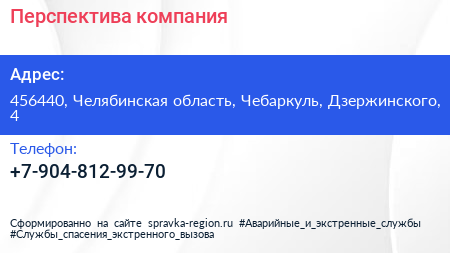 Перспектива, компания по адресу 456440, Челябинская область, Чебаркуль, Дзержинского, 4 в дальнейшем Организация, размещена в следующих категориях: