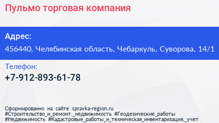 Пульмо, торговая компания по адресу 456440, Челябинская область, Чебаркуль, Суворова, 14/1 в дальнейшем Организация, размещена в следующих категориях: